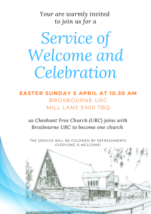February 25, 2026 Broxbourne News, Cheshunt News, Hertford News by Stepanka Amalgamation Welcome Service at Broxbourne URC 5 April at 10:30 am